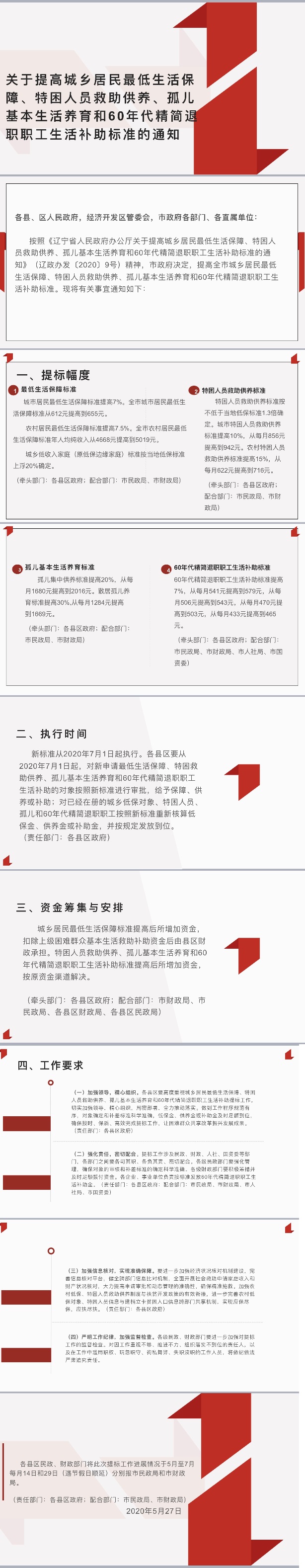 文件链接:抚顺市人民政府办公室关于提高城乡居民最低生活保障、特困人员救助供养、孤儿基本生活养育和60年代精简退职职工生活补助标准的通知