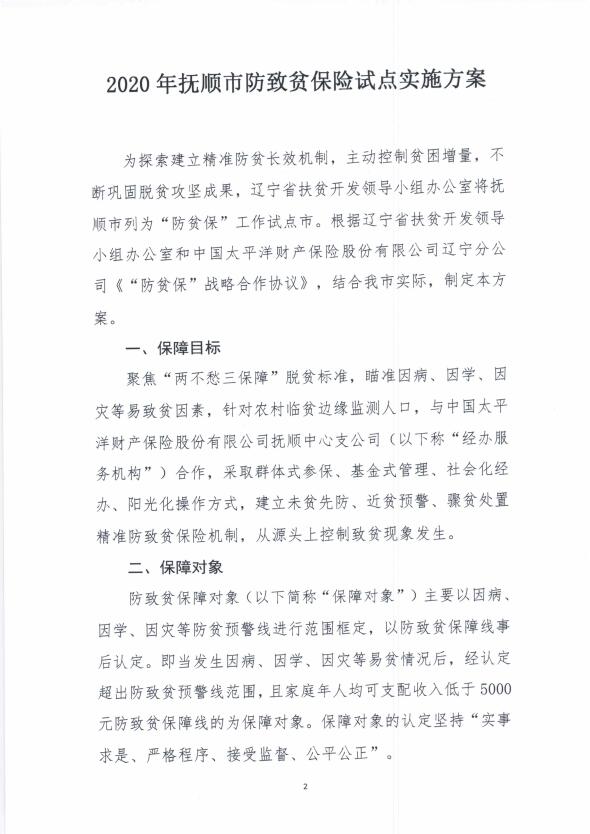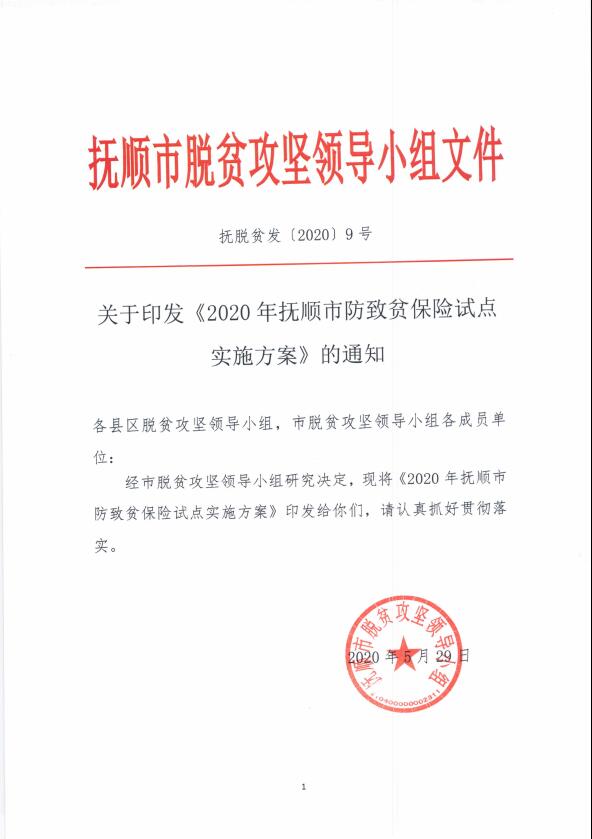 关于印发《2020年抚顺市防致贫保险试点实施方案》的通知