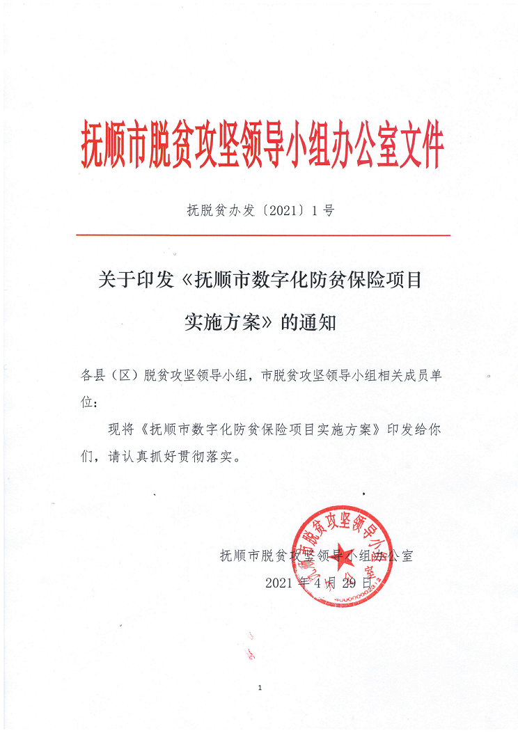 关于印发《抚顺市数字化防贫保险项目实施方案》的通知(抚脱贫办发 ﹝2021﹞1号)