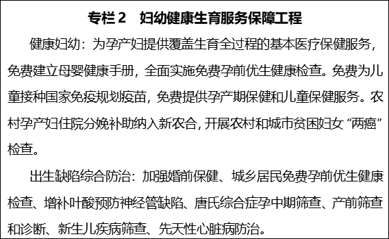 提升妇幼健康服务能力。推进优生优育全程服务,提高婚前医学检查、孕前优生健康检查、住院分娩、母婴保健、避孕节育、预防接种等服务能力。加强出生缺陷综合防治, 强化出生缺陷防治宣传和健康教育,落实婚前医学检查、孕前优生健康检查和产前筛查,促进婚前医学检查率、孕前优生检查率、产前筛查率逐步提高。提高孕产妇和新生儿危急重症救治能力,进一步降低孕产妇和新生儿死亡率。加强高龄产妇、再生育和不孕不育人群服务。提高农村和城市贫困妇女"两癌"(宫颈癌、乳腺癌) 筛查率和早诊早治率。做好流动孕产妇和儿童跨地区保健服务。