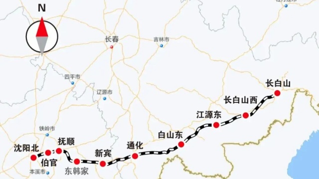 沈白高铁作为国家“十四五”规划重点项目,是“八纵八横”高铁主通道的区域连接线、东北高铁网重要组成部分。正线起自沈阳北站,沿线经辽宁省沈阳市、抚顺市,吉林省通化市、白山市、延边朝鲜族自治州等5个地市(州),终至长白山站,全长约430公里,设计时速350公里,共设沈阳北、伯官、抚顺、东韩家、新宾、通化、白山东、江源东、长白山西、长白山等10座车站。