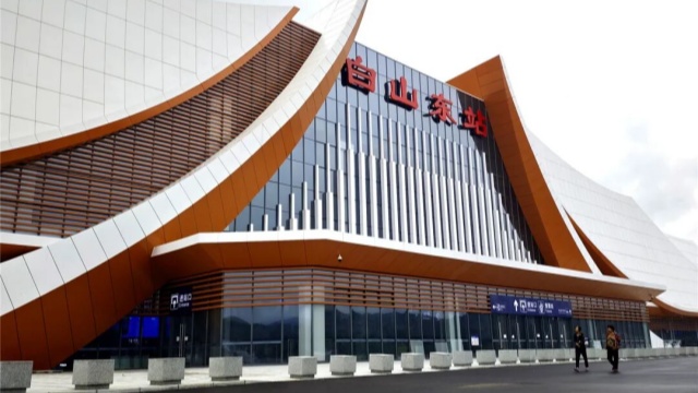 “皑皑长白下,郁郁雪林中”。白山东站以长白山为原型,将名山、秀水等元素融入其中,两侧采用白色曲面叠级幕墙,形似覆满皑皑白雪的长白山。