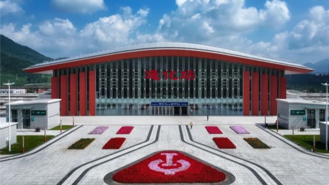“山水剪影、宏图展幕”。通化站舒展大气的屋顶曲线和下部幕墙阵列呼应山水剪影的层次感。站房两侧造型彰显浑厚的历史感,建筑色彩鲜明,寓意着通化市的发展拉开新的宏图序幕。
