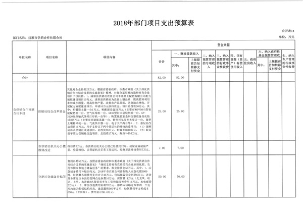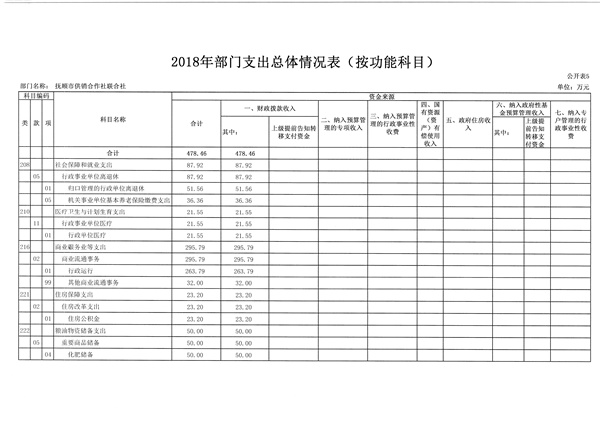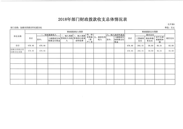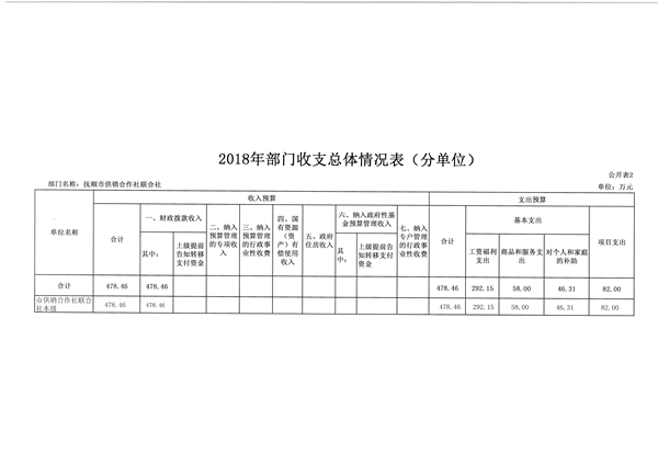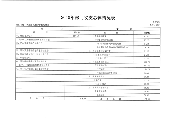 抚顺市供销合作社联合社2018年收支总预算478.46万元。比2017年预算减少165.82万元,减少了25.74%,主要是退休职工工资等项支出均已转到社保开支等因素。