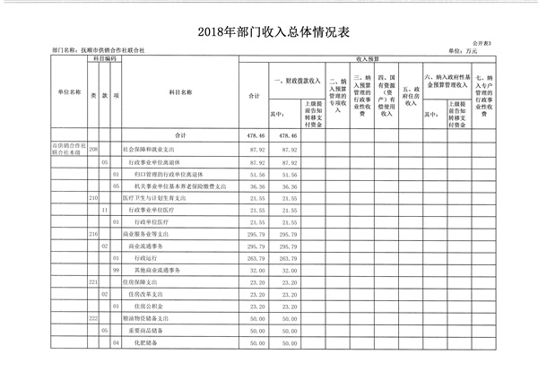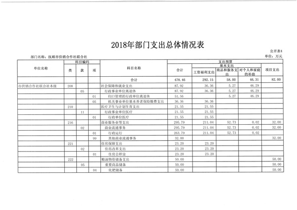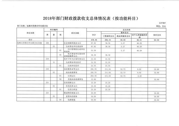 抚顺市供销合作社联合社2018年财政拨款收支总预算478.46万元,收入预算为一般公共预算拨款,包括当年财政拨款收入478.46万元。按功能支出包括:社会保障和就业支出87.92万元;医疗卫生与计划生育支出21.55万元;商业服务业等支出295.79万元;住房保障支出23.20万元;粮油物资储备支出50万元。按经济支出包括:工资福利支出292.15万元;商品和服务支出58万元;对个人和家庭的补助支出46.31万元;项目支出82万元。